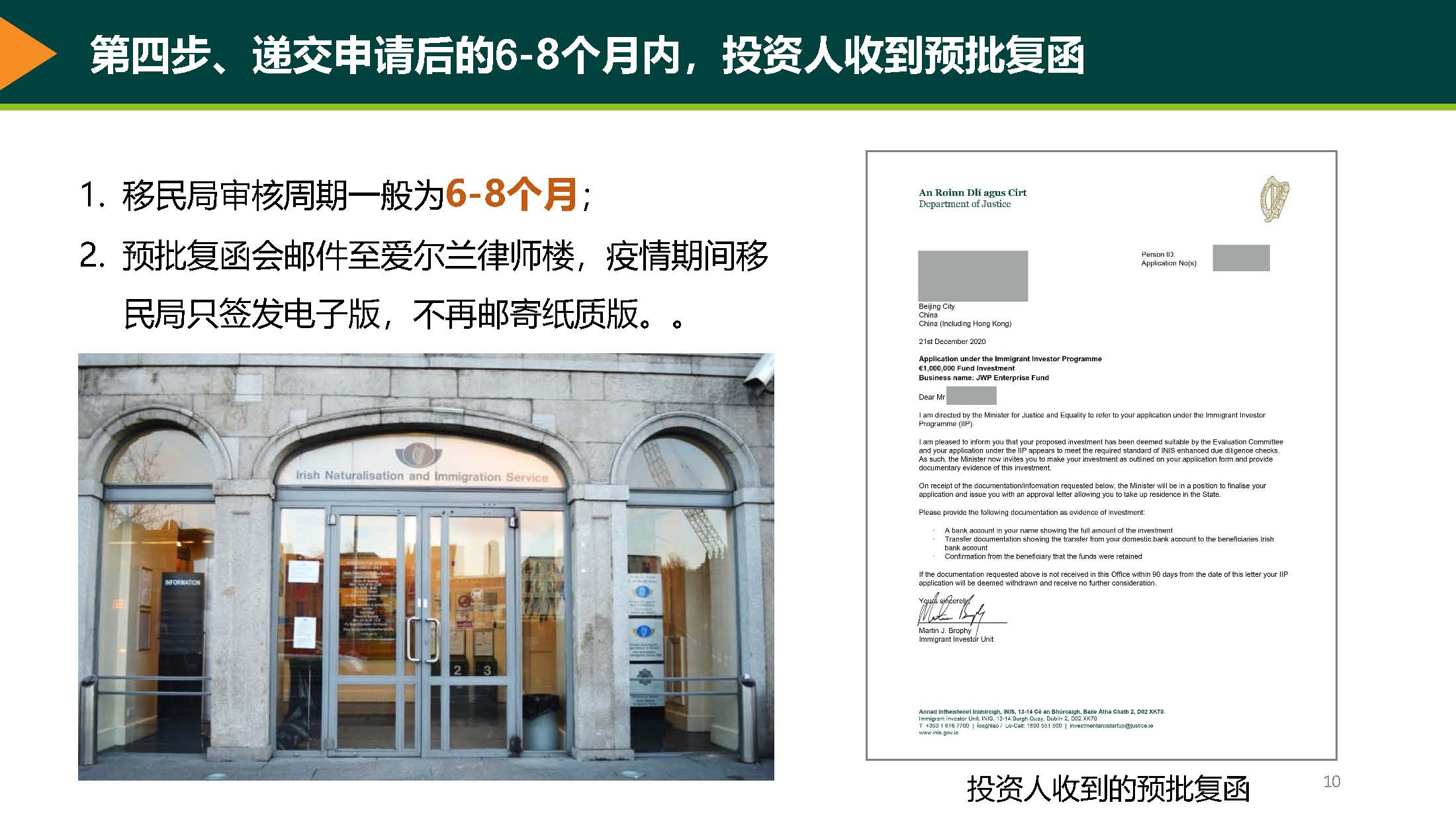 爱尔兰投资居留计划JWP基金项目申请流程 爱尔兰投资移民项目已经关停 ΞΞ目录 JWP ICAV基金项目申请流程 第一步、投资人确定移民方案 第二步、主申请人签署移民服务协议,准备资产证明文件 第三步、签署律师协议、支付移民费用递交申请文件 3.1主申请人与爱尔兰律师楼签署法聘协议 3.2签署法聘协议后的10个自然日内,支付移民费用 3.3将申请文件邮寄至律师楼,律师在窗口期递交移民申请 第四步、递交申请后的6-8个月内,投资人收到预批复函 第五步、提交反洗钱文件,并完成基金认购 5.1申请人提供反洗钱文件,发至存托机构进行审核 5.2填写基金认购申请表,一式一份 5.3在预批复函签发日起90天内完成100万投资义务 5.4完成100万投资义务 第六步、获得原则性获批函 第七步、预约办理Stamp4身份、办理单次签证,入境 7.1在移民局官网预约办理Stamp4身份的时间 7.2所有投资人办理爱尔兰D-IIP类短期单次签证,准备入境 第八步、面见律师提交文件办理Stamp4身份 8.1面见移民律师,交接申请文件 8.2投资人前往移民局办理Stamp4身份 2023-01-09 1473