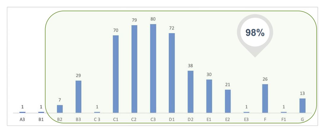 - 这些物业的能源评级分布图清晰地展示了大部分住宅(如C1, C2, C3, D1, D2, E1, E2, F, G等级别)迫切需要进行节能改造,以符合现代能效标准和政府的绿色目标。