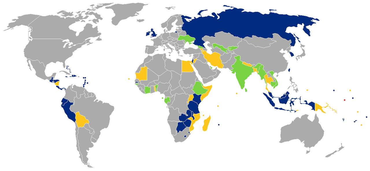 瑙鲁护照免签国家和地区分布图(绿色、黄色及蓝色部分)