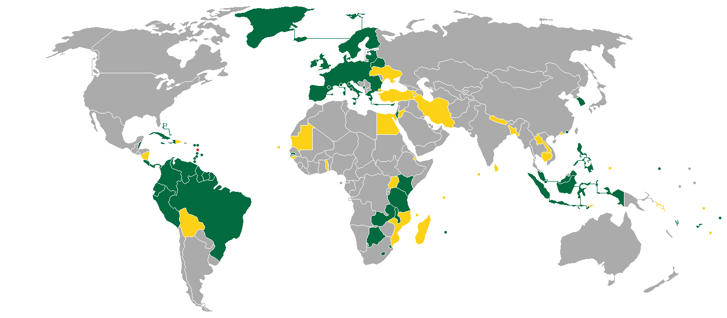 多米尼克护照免签国家和地区分布图(黄色与绿色部分)