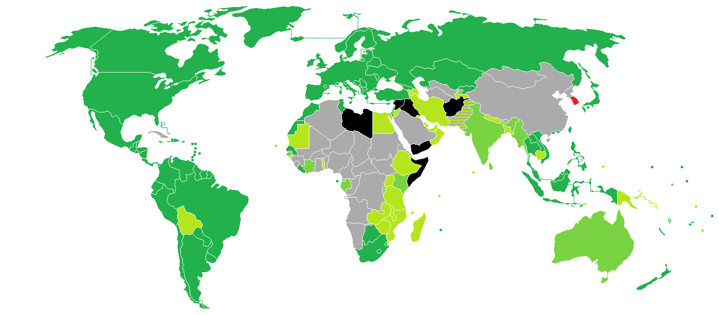 备注:黑色部分为韩国政府禁止旅行的国家:阿富汗,伊拉克,利比亚,索马里,叙利亚,也门。