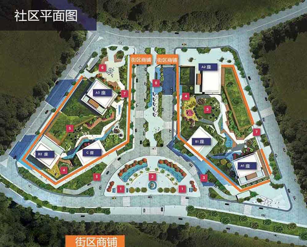 1.地铁口(2019年底开放);2.艾迪姆社区广场;3.露天停车位;4.儿童游乐场;5.公共休闲区;6.景观水池;7.社区入口;8.公园