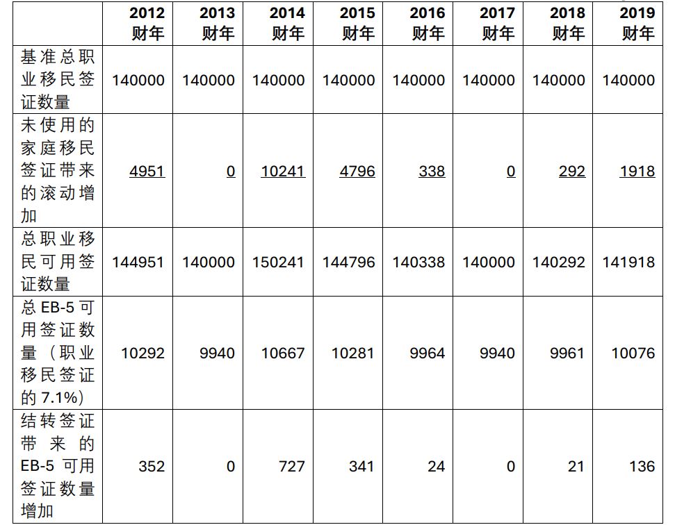 未使用的家庭类签证的结转可以全面增加EB-5签证数量,而EB-5大类别内未使用的预留签证的结转可以增加各个子类别类别的签证数量。